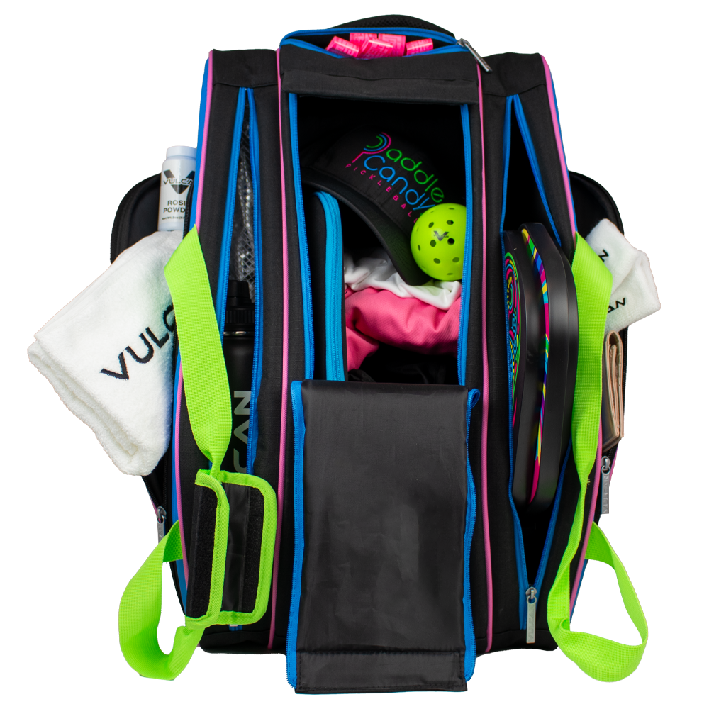 The Paddle Candy Pro Pickleball Backpack is the ultimate tournament backpack with signature Paddle Candy style. This wide-body style backpack features a dual zipper, extra-large center pocket for easy access. There is plenty of storage space for extra clothes, towels and paddles. The two large side insulated compartments for up to 6 paddles, or keeps drinks and snacks cool, two smaller storage compartments for accessories, an inside zippered pockets for valuables, and a ventilated shoe compartment. An easy access top zippered compartment for cell phones, wallet, and keys. The dual fence hanger hooks allow you to keep your bag off the ground.